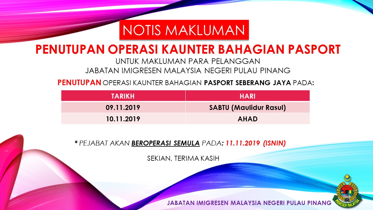 Imigresen Penang On Twitter Penutupan Operasi Kaunter Bahagian Pasport Untuk Makluman Para Pelanggan Jabatan Imigresen Malaysia Negeri Pulau Pinang Penutupan Operasi Kaunter Bahagian Pasport Seberang Jaya Pada Sabtu 09 November